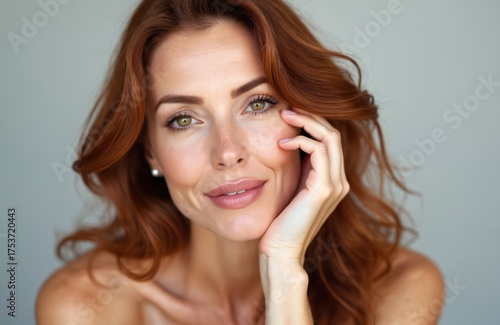 Close up portrait of beautiful middle aged woman with red hair. Shows natural healthy skin. Lady smiles gently. Hand touches face near eye. Models beauty skincare wellness anti age cosmetic products
