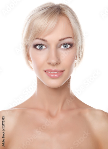 Close up portrait of beautiful young woman face. Isolated on white background.