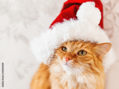 Close up portrait of cute ginger cat in Santa Claus hat. Fluffy pet staring in camera. Christmas or New Year symbol.