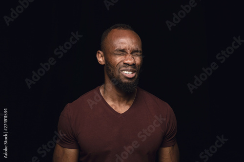 Close up portrait of young african man isolated on black studio background. Photoshot of real emotions of male model. Mourning, mental suffering. Facial expression, human nature and emotions concept.