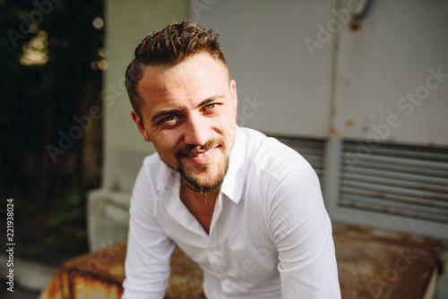 Close up portrait of young man in sunglasses in the streets outdoors posing next to the old building. Happy, fan, true emotions.