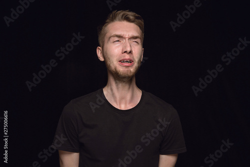 Close up portrait of young man isolated on black studio background. Photoshot of real emotions of male model. Crying, sad, dreary and hopeless. Facial expression, human emotions concept.