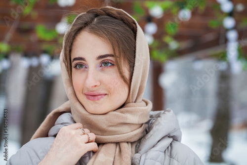 foulard, beige, winter, down jacket, jacket, kerchief, cravat, cravat, muffler, woman, fashion, female, beautiful, model, brunette, person, pretty, beauty, style, cold, portrait, young, attractive, nature, one person, clothes, wool, clothing, hair, happy, white, cheerful, cute, woolen, background, park, season, carefree, trendy, copy space, caucasian, face, casual attire, girl, closeup, knitted, casual clothes