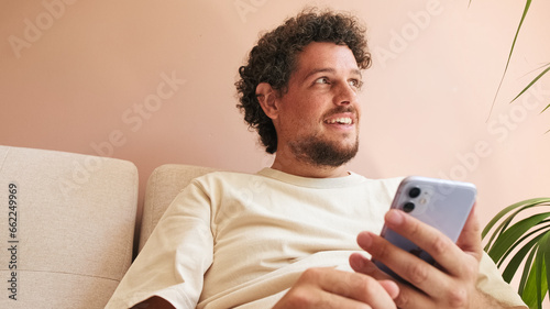 Close up, positive young man with curly hair and beard, sitting on sofa in cozy living room, scrolls his mobile phone on the screen
