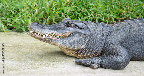 image, horizontal, colours, nobody, meme, outside, outdoors, alligator, gator, animal, mammal, fauna, path, green, plant, tropical, eye, teeth, snout, grey, black, orange, scale, skin, copy space, profile, crocodile, species, head, fresh water, predator, wetland, habitat, belly, leg, jaw, caiman, reptile, webbed, foot, strong, ferocious, scarey, majestic, fierce, carnivore, epidermis