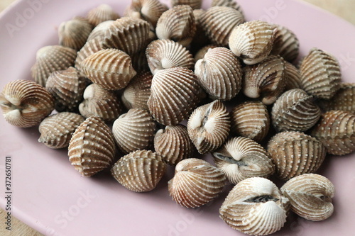 Close up seafood Thailand menu called Hoi Krang Pao or Grilled Cockle on a plate.