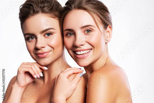 Close up sensual portrait of brunette women girlfriends with flawless fresh skin. Studio portrait on white background. Cosmetics concept