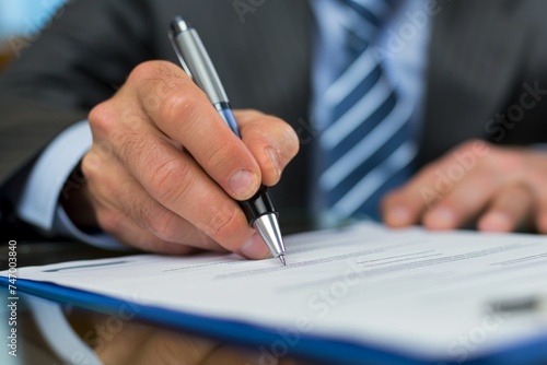 Close up shot of a businessman signing a business contract. Businessman writing on a paper document