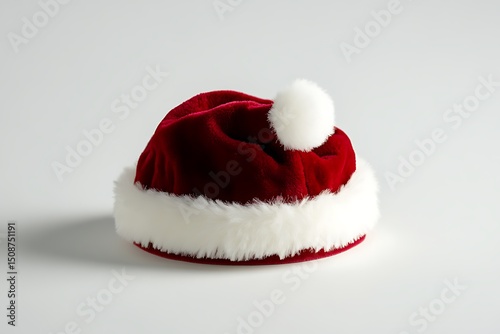 hat, santa, christmas, holiday, red, white, pom, close, up, shot, background, surface, trim, festive, celebration, season, merry, decoration, clothing, apparel, headwear, winter, holiday season, red hat, white background, new year, christmas, soft, fluffy, velvet, traditional, closeup, studio