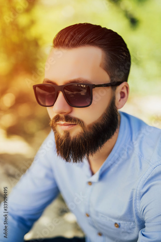 Close up shot of young man. Confident bearded serious handsome man wearing in blue shirt and in sunglasses. Men's beauty, fashion. Outdoor portrait.