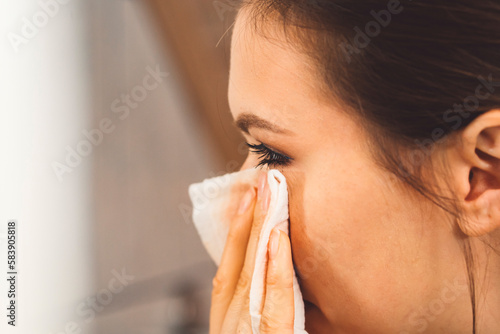 Close up side view woman cleaning her eye make up with a cotton pad