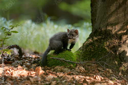 Close up, Stone Marten, Martes foina, juvenile tiny predator of spruce forest, climbing at old tree. Animal in captivity. Close up photo, blurred nature background. European forest, Czech republic.