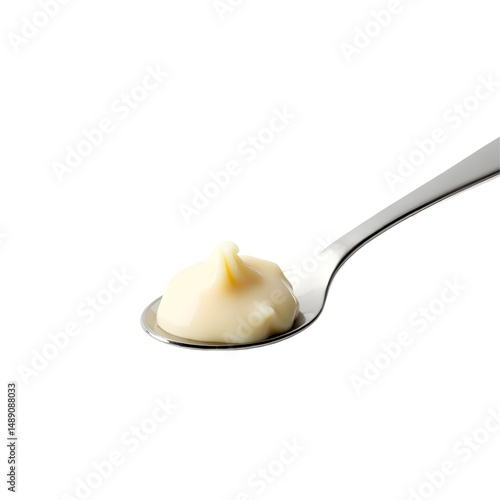 Close up studio shot featuring a spoonful of creamy white cheese, presenting a culinary element on a shiny stainless steel spoon against a simple backdrop