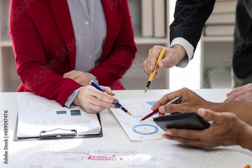 Close up Team of colleagues discussing business Accounting using calculating income-expenditure and calculator analyzing real estate investment data report Financial and tax systems concept.