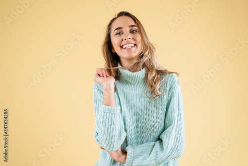 Close up thoughtful pretty girl looking with a smile. Isolated on yellow background