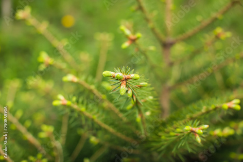 Close up tree spring new shoots. Green macro background with renewal tree in selective focus.