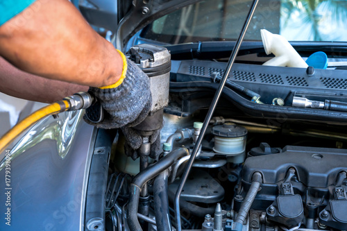 Close up unknown auto mechanic with tool fixing car in auto repair shop
