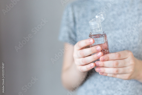 Close- up view of a little girl using a small portable antibacterial hand sanitizer. hand sanitizer gel for hand hygiene spread protection.
