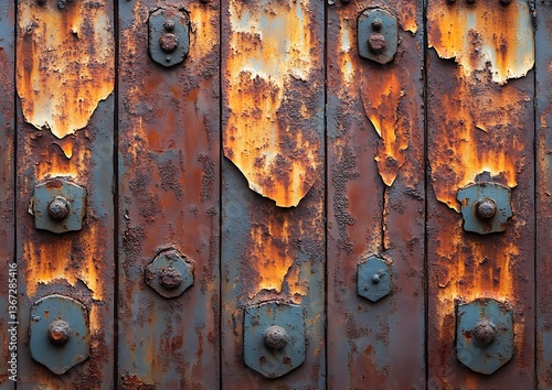 rust, metal, texture, aged, weathered, corrosion, iron, steel, panel, bolt, rivet, distressed, grunge, surface, peeling, abstract, orange, brown, blue, gritty, industrial, decay, damaged, rough, detail, background, fragment, pattern, closeup, architecture, structure, wall, design, vintage, material, oxidation, old, heavy, deterioration, fractured, worn, obsolete, ruined