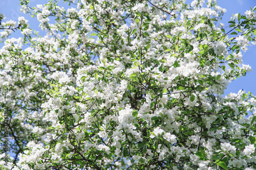 Close up view of blossoming apple tree at the springtime. Natural beauty concept.