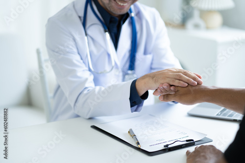 Close up view of friendly doctor hold patient hand in office during the visiting. giving hope and empathy.