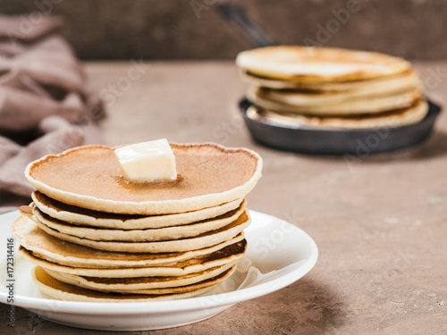 Close up view of homemade pancakes. Stack of pancakes with butter on brown concrete background.