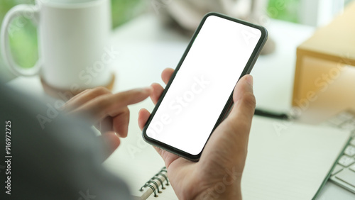 Close up view of man hands holding smart phone over working desk. Blank screen for your advertise design.