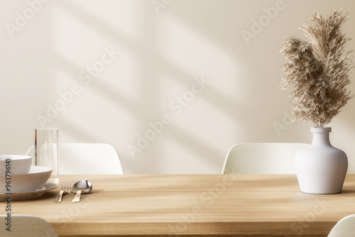 minimal, modern, dining, room, kitchen, wood, interior, contemporary, empty, wall, copy space, table, chair, furniture, indoor, luxury, ornate, decoration, decor, nordic, design, eatery, house, home, pantry, apartment, closeup, comfortable, cosy, stylish, sunlight, shadow, scandinavian, vase, white, bright, lifestyle, style, architecture, elegance, fashionable, simple, basic, background, warm, brown, tableware, blank, three-dimensional
