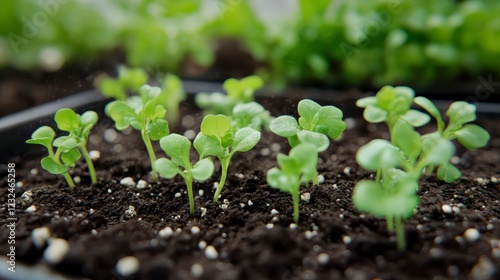 Close up view of vibrant green seedlings sprouting from dark brown soil in a black plastic tray. Water droplets are visible on some leaves. The