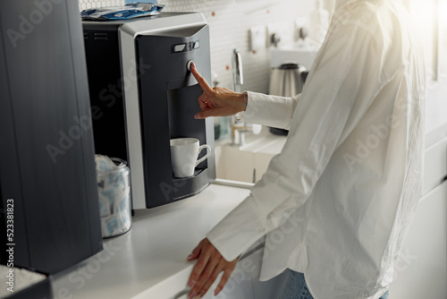Close up view of woman making coffee with coffeemachine during office break time. Blurred background
