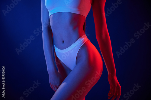 Close up view. Young woman in underwear is in the studio with neon lights