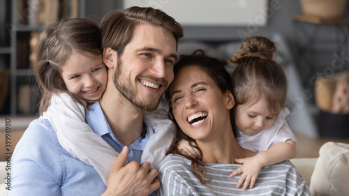 Close up wide banner panoramic view of happy young Caucasian family with two small daughters have fun at home. Smiling mom and dad feel playful enjoy weekend relaxing with little girls children.