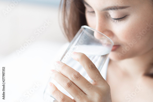 Close up woman drinking pure water from glass with light in the morning, Selective focus