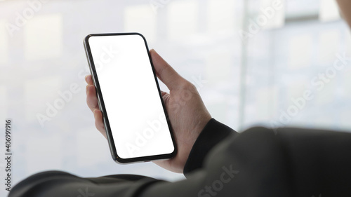 Close up Woman hand Using a Smart Phone with white screen at home.