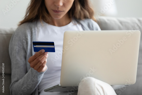 Close up woman holding credit card and using laptop, sitting on sofa at home, young female customer shopping online in internet store, making purchase, digital payment or banking service