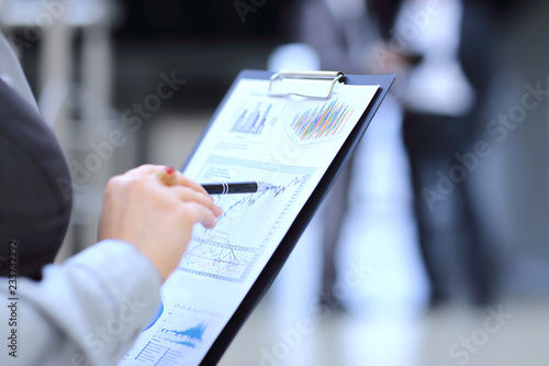 close up.business woman checks the financial report.