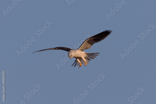 Close view of a white-tailed kite flying, seen in the wild in North California