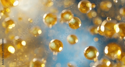 Close view of gold nanoparticle drug capsules with vibrant yellow spheres and a gentle blue and gold blurred background
