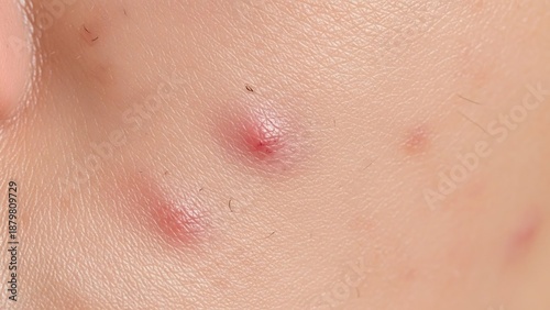 Close-animated movie macro view of human skin texture with inflamed red pimples and fine hairs, showcasing pores and imperfections.