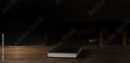 Closed Bible book on a wooden table in the dark.