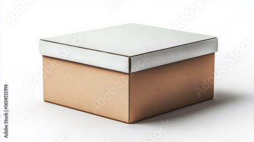 Closed cardboard box with white lid on white background
