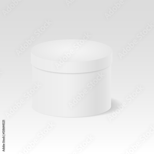 Closed gift box. White round closed box. Package. 3D. Cylinder. Vector illustration.