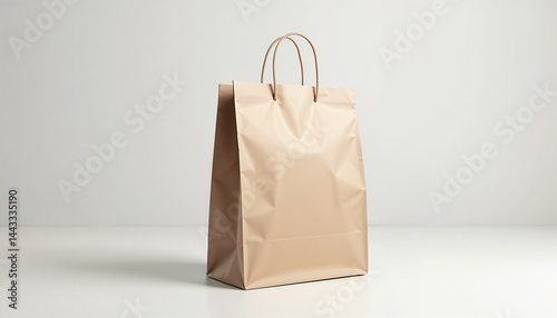 "Closed kraft paper bag mockup with handles on white background, minimalist packaging with soft lighting for branding presentation [with copy space]"