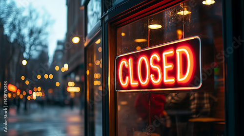Closed neon sign glows on a rainy city night, symbolizing business closure or end of service. Atmospheric street scene.