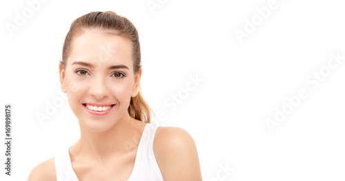 Closed up of Beautiful face of young adult caucasian woman smile with clean fresh skin isolated on white