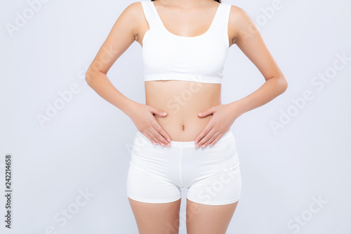 Closeup asian woman beautiful body diet with fit isolated on white background, model girl weight slim with cellulite or calories, health and wellness concept.