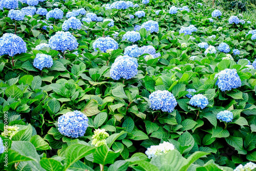 Close-Up Blooming Blue Hydrangea Flowers in Natural Garden Light