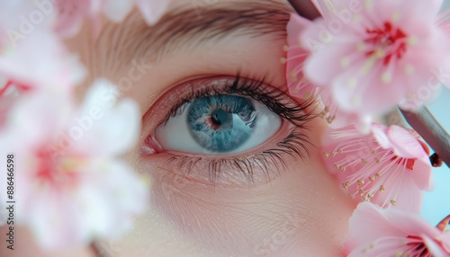 Closeup Blue Eye Surrounded by Pink Flowers, Soft Focus, Delicate Beauty, Springtime Bloom, Feminine Elegance, Nature Inspiration, Floral Photography, Eye Macro, Beautiful Woman, Artistic Portrait