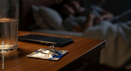 closeup, broken, ripped, condom, wrapper, nightstand, lover, couple, dark, smartphone, blur, background, protection, contraceptive, sexual, health, intimate, adult, game, concept, night table, night, bedchamber, house, people, 2