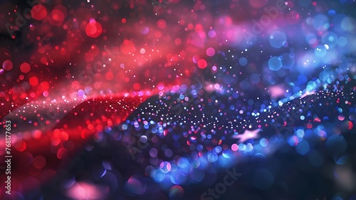 Close-up capture of red white blue sparkling glitter light particles abstract background